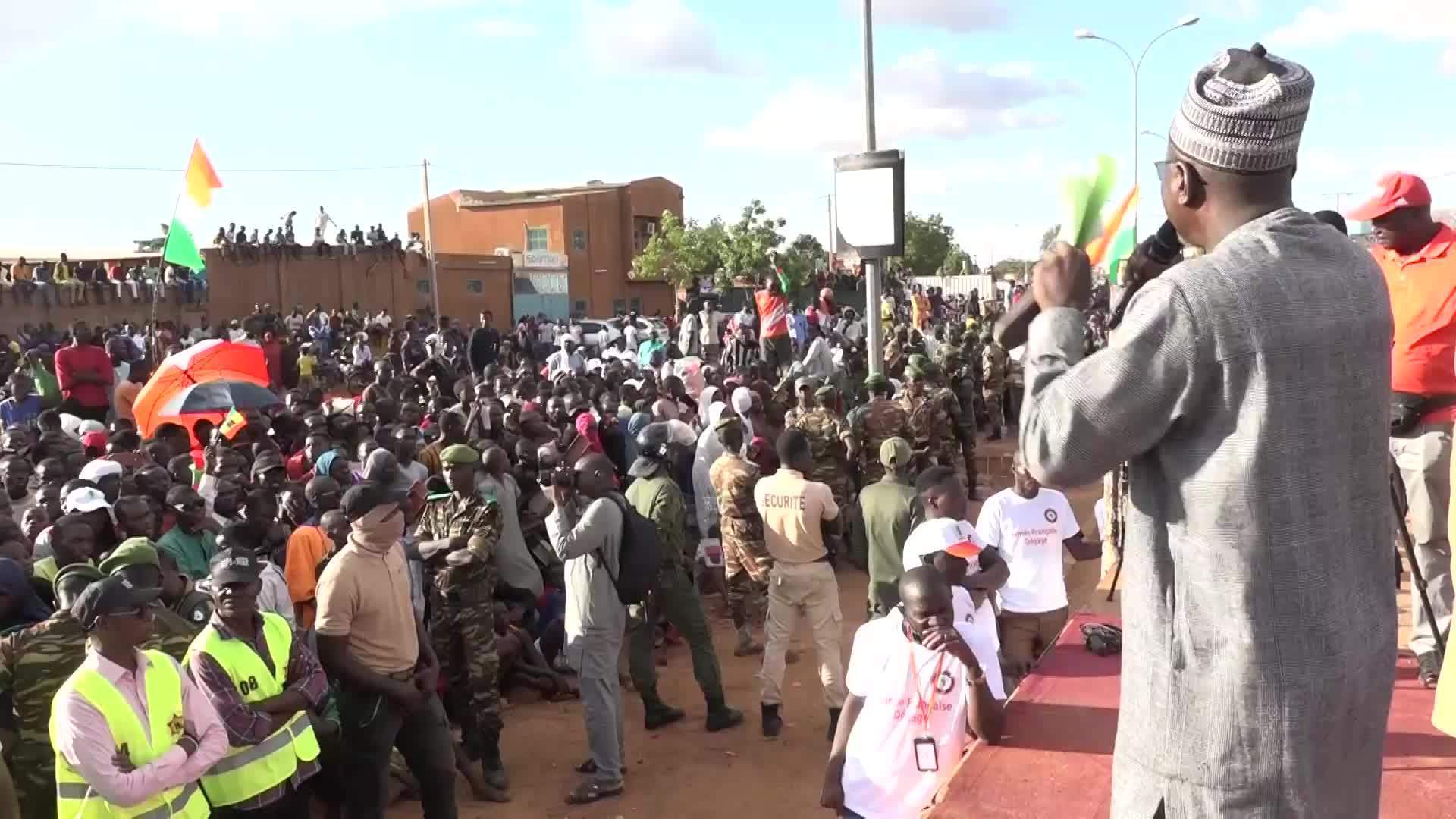 « تجمع آلاف المتظاهرين في نيامي لدعم قادة الانقلاب ومطالبة القوات الفرنسية بمغادرة البلاد، الأحد. وخاطب المتحدثون الحشد من المنصة، وتم نشر الجيش لضمان الأمن ». النيجر كانوا سيردون بهذه الطريقة. لم نعتقد أبدًا أن شعب النيجر سيكون متماسكًا إلى هذا الحد. لقد رأيتم ما يحدث، الملايين من الناس خرجوا ليقولوا لا، إنه أمر لم يسمع به من قبل. للمرة الأولى، شهدنا عدة انقلابات، لكن لم نشهد أبدًا هذا النوع من التعبئة. قال أحد المتظاهرين: « اليوم رأيت الأشخاص الذين أمضوا الليل هنا وترى أولئك الموجودين هناك الآن ». وشدد المتظاهر على أن هذا يشير إلى أن التعبئة لا تفقد قوتها بل تزداد قوة. وفي 26 يوليو/تموز، وقع انقلاب عسكري في النيجر، مما أدى إلى إقالة الرئيس محمد بازوم وتنصيب الجنرال عبد الرحمن تشياني قائد الحرس الرئاسي رئيساً جديداً للدولة، كما أعلن الحكام العسكريون إلغاء الاتفاقيات العسكرية مع فرنسا رداً على الانقلاب، فرضت الجماعة الاقتصادية لدول غرب أفريقيا (ECOWAS) عقوبات وحذرت من عمل عسكري محتمل. وفي وقت لاحق، كانت هناك احتجاجات واسعة النطاق لدعم الجيش في شوارع نيامي. وحذرت الدولتان المجاورتان مالي وبوركينا فاسو من أي تدخل من قبل دول غرب أفريقيا الأخرى. الدول، بحجة أنه سيعتبر « إعلان حرب » ضدها أيضًا. ويمثل هذا الحدث الانقلاب الخامس في النيجر منذ أن حصلت البلاد على استقلالها عن فرنسا في عام 1960، وهو الانقلاب العسكري السابع الذي يحدث في غرب ووسط أفريقيا في غضون مدى ثلاث سنوات. »